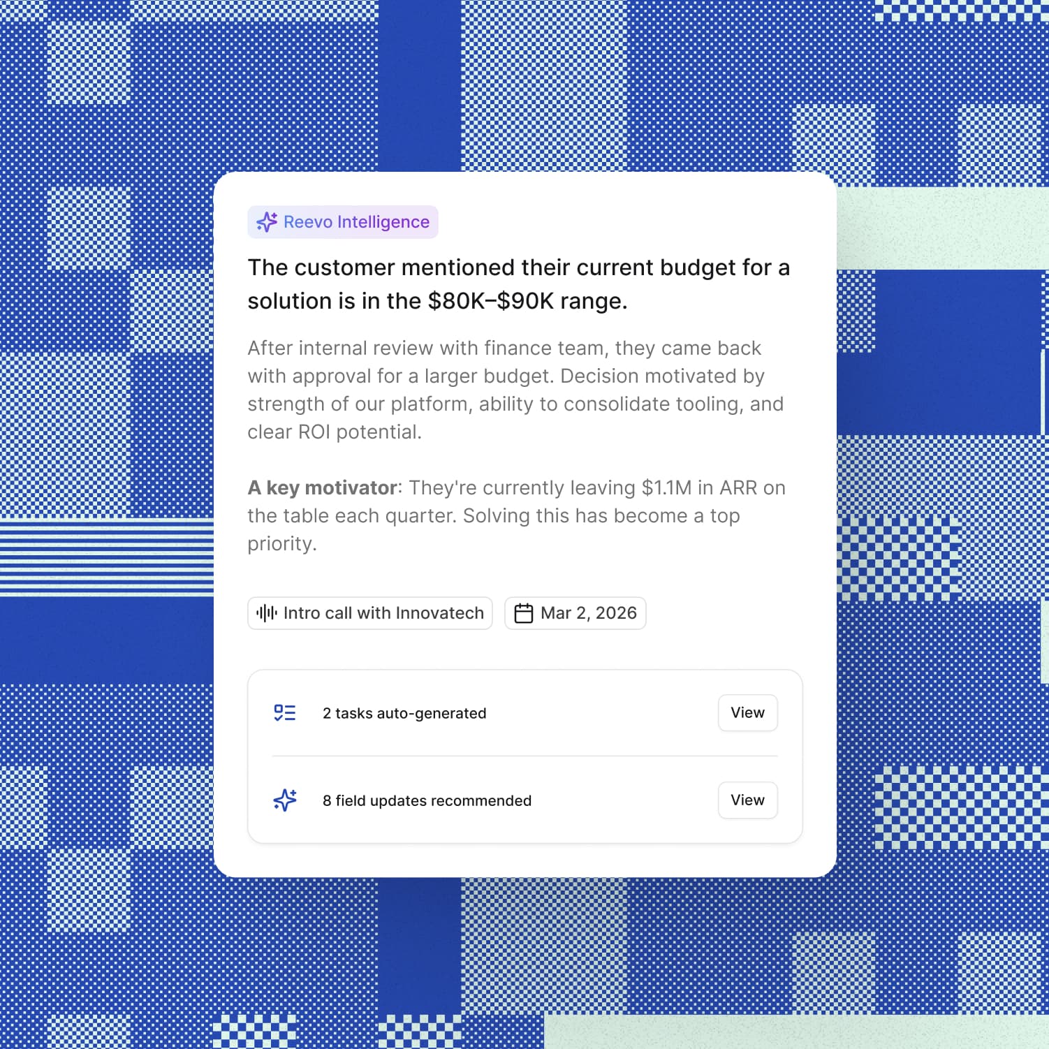You don’t need more meetings—you need better outcomes. Reevo’s AI records, transcribes, and analyzes every call, giving you the insights to master your pitch and the automation to close deals faster.