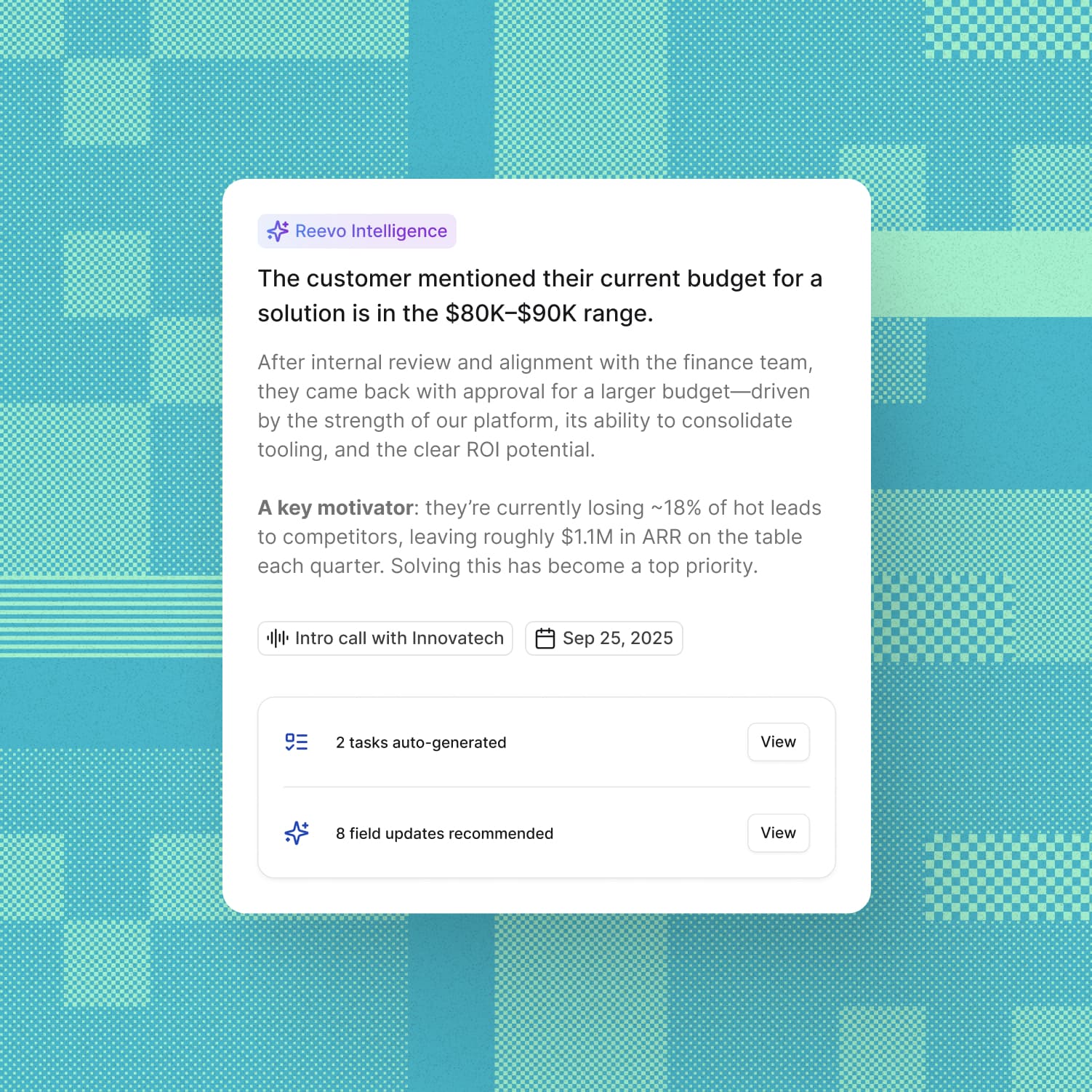Define rules to trigger quotes based on deal logic, and let Reevo instantly route anything that needs a sign-off to the right person. No chasing approvals, no breaking momentum.